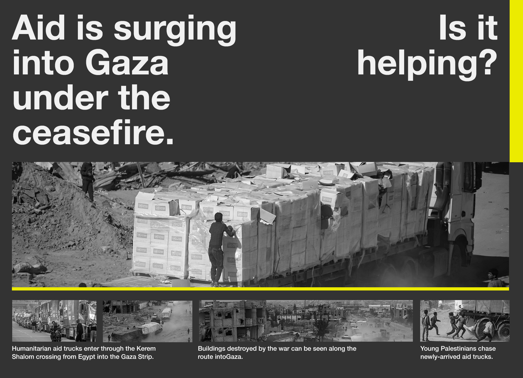 The stark black-and-white treatment and direct headline help viewers absorb the story quickly, without distraction. Each visual element is structured to guide the viewer from the promise of incoming aid to the reality of limited access.